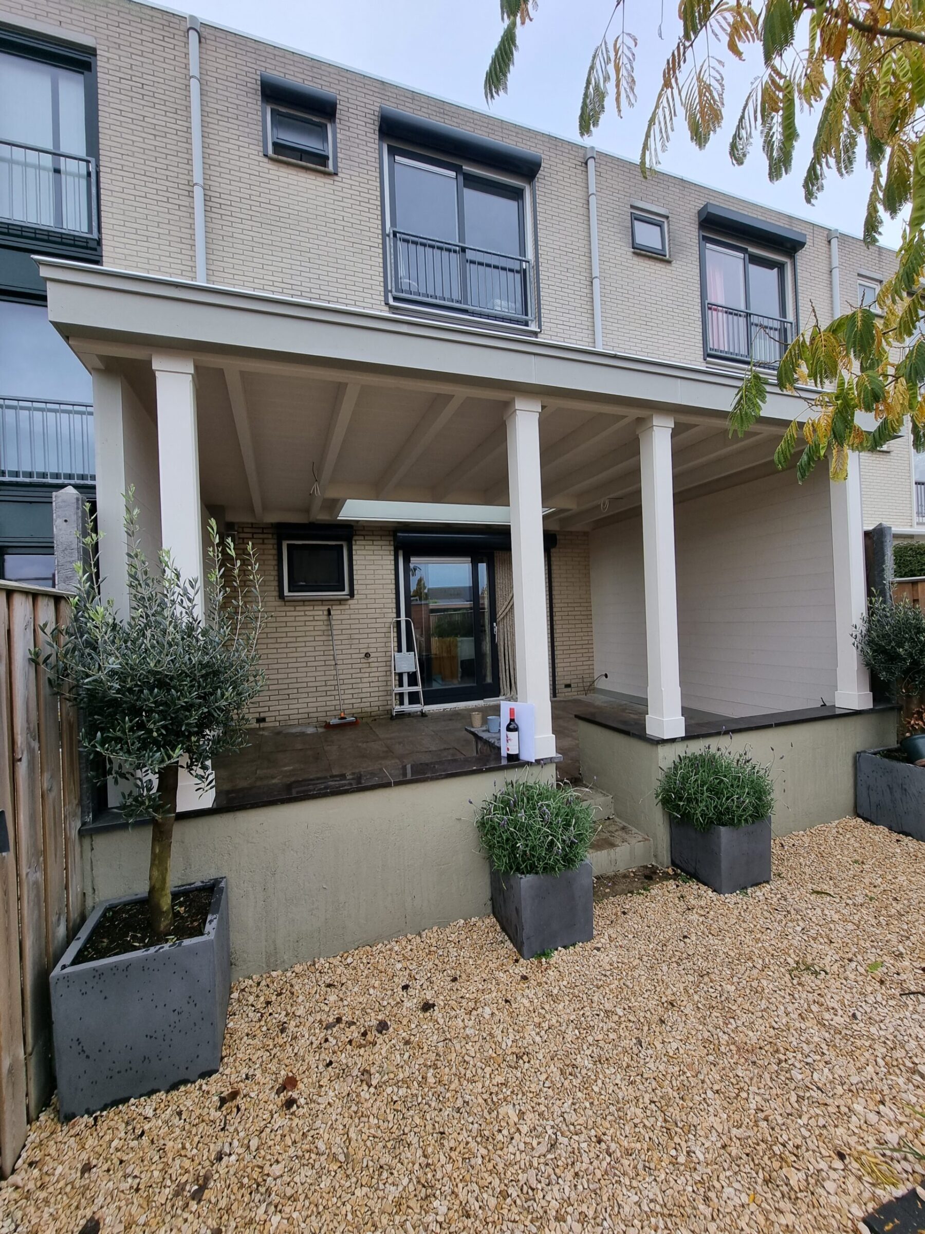De bewoners van deze moderne woning beschikten al over een mooi terras. Een terras voorzien van een mooi gestucte muur met een klein trapje. We pasten de overkapping er helemaal op aan. De staanders bouwden we op de muurtjes. En zo ontstond een prachtig geheel.