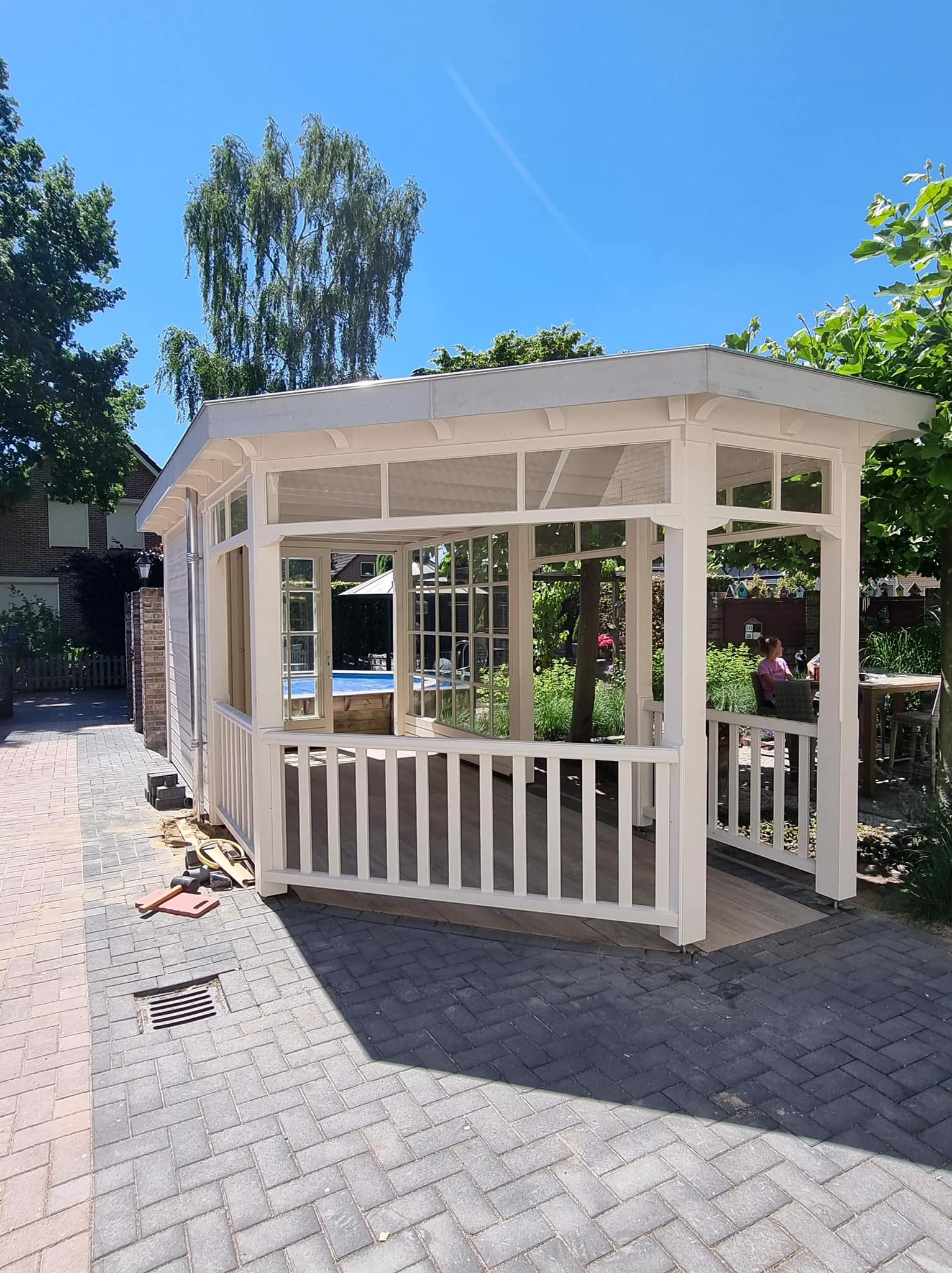Deze houten veranda is geheel vrijstaand. We bouwden een mooie buitenruimte voorzien van balustrades. Een dichte wand voor privacy. Een glazen wand met ruitverdeling en zelfs schuifdeuren. Maatwerk in optima forma.